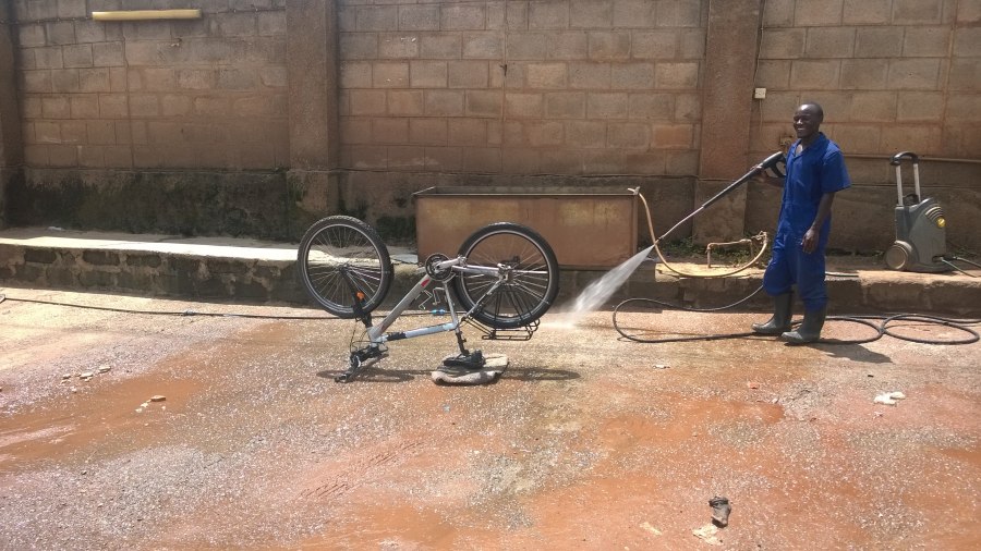 After having cycled about 2.500 km in Africa, Karo found Baraka deserved a little treat at the car wash …